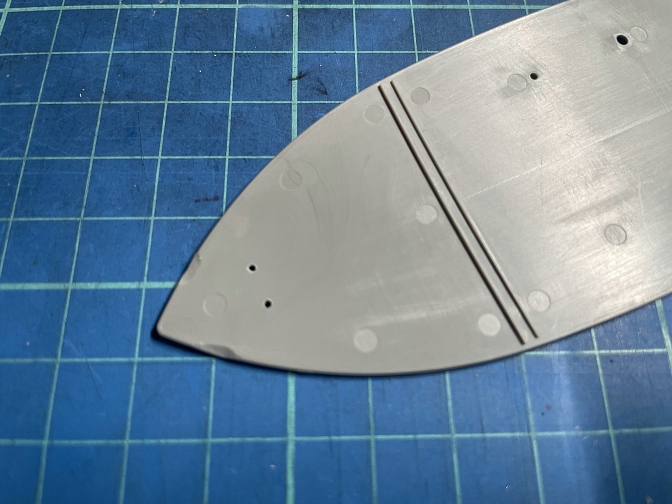 ビジルキールと呼ぶらしい部分を再現したエッチングパーツは貼り付けるキットになっていると思いますが、船体に埋め込む方式としました。