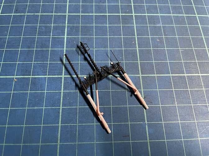 乾燥後、マスキングゾルを剥がした後、D5,D6のパーツを接着し後方門型マストは完成としました。