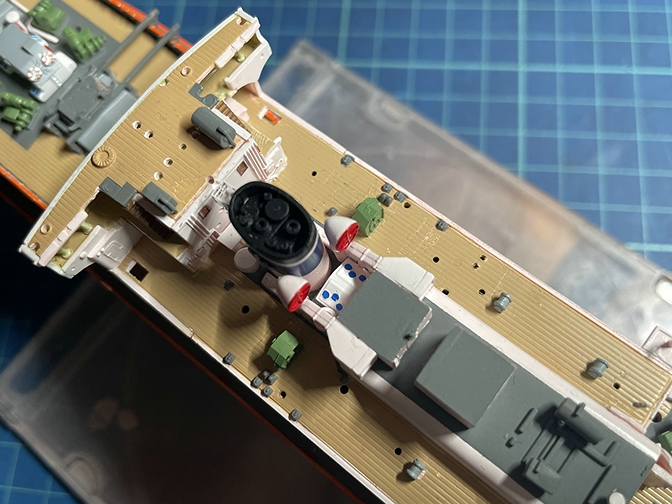 SHIP MODELS一昨日、昨日再塗装したX10と中央科目倉庫のパーツを船体に接着しました。