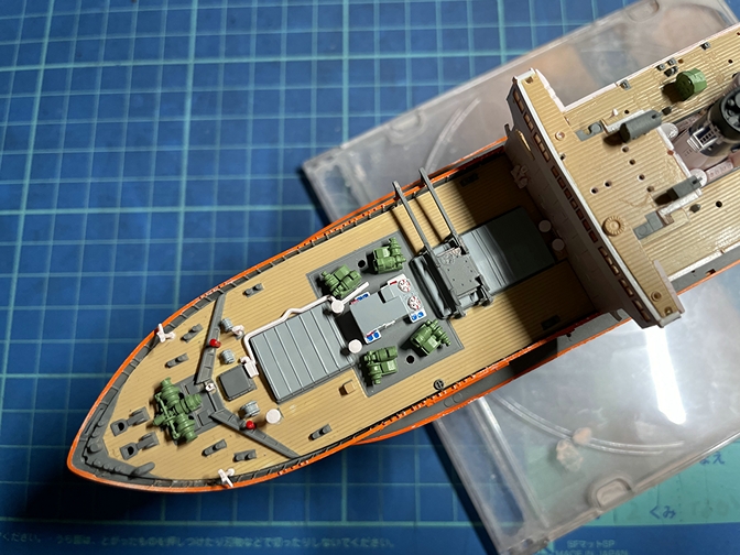 一昨日、昨日再塗装したX10と中央科目倉庫のパーツを船体に接着しました。